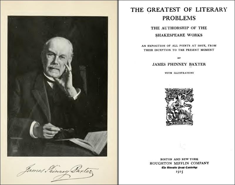 [12] James Phinney Baxter. The Greatest of Literary Problems: The Authorship Of The Shakespeare Works. New York: Houghton Mifflin, 1915 & 1917