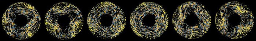 Если наложить эту абстрактную математику Арнольда на феномен васцилляции в наглядных гидродинамических экспериментах Раймонда Хайда, то можно увидеть КАК конкретно происходит в природе порождение пары взаимно дополняющих асимметричных инвариантов. Когда вращающаяся жидкость имеет градиент температуры – или иначе разность потенциалов энергии – между центром и краем, то в едином изначально вихре сначала образуются регулярные волны, затем волны превращаются в вихри-зерна, а затем в колебательном процессе качания взаимные превращения повторяются снова и снова.