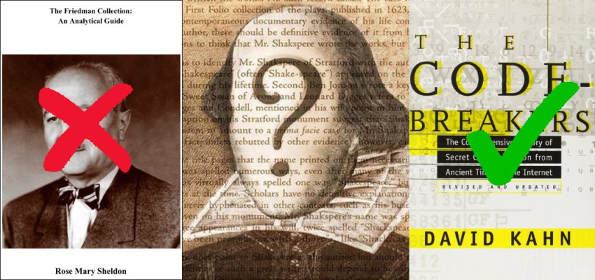 Одна из этой пары книг – Дэвид Кан, «Взломщики кодов: история секретного письма» [o3] – быстро стала знаменитой и по праву носит сегодня титул «Библии для историков криптографии». О специфических особенностях этой большой работы и о её неслучайных изъянах, имеющих прямое отношение к проблемам шекспироведения, здесь с подробностями рассказывалось ранее, в материале «Рефлекс АНБ – Рубить концы!» [i4].
