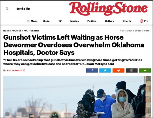 «Жертвы огнестрельных ранений, говорит доктор, вынуждены ждать медицинской помощи из-за того, что больницы Оклахомы переполнены людьми с отравлениями от передоза лошадиным дегельминтизатором.» (Rolling Stone , 3 сентября 2021)