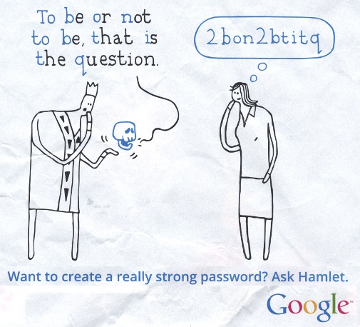 В частности, вполне конкретные советы Гугла относительно правильного создания сильных паролей появились на рекламных щитах в лондонской подземке и в виде полностраничной рекламы в респектабельном журнале The Economist. На этих афишах пример «очень сильного пароля» выглядит следующим образом – «2bon2btitq».  Как поясняет сопутствующая картинка, это буквосочетание построено на основе первых букв в словах знаменитой цитаты из шекспировского «Гамлета»: «Быть иль не быть, вот в чем вопрос» (To be or not to be, that is the question).
