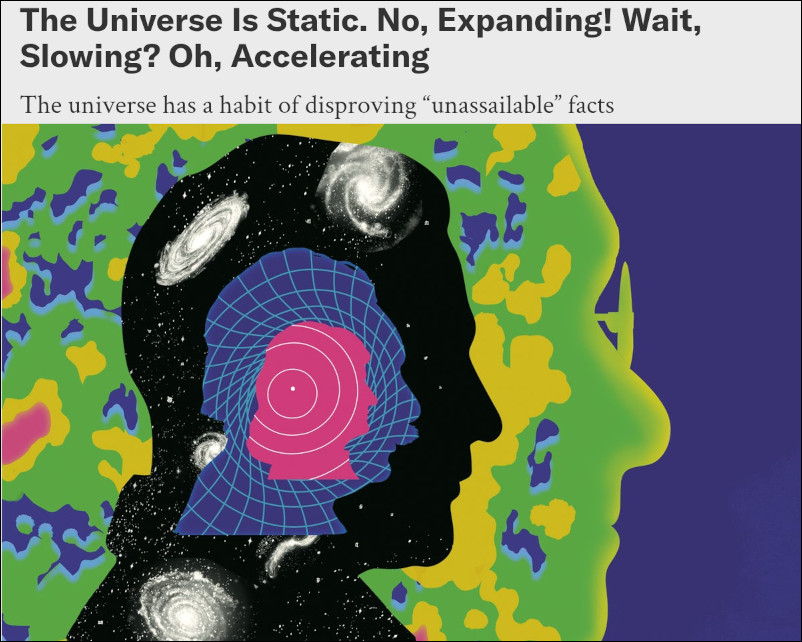 Конкретная статья этого номера SciAm, посвящённая подобным разворотам в области космологии, получила название «Космос пересмотренный: Вселенная имеет привычку опровергать “неопровержимые” факты» [o1]. Онлайновая версия той же самой публикации носит иной, ещё более развёрнутый ироничный заголовок: «Вселенная продолжает переписывать космологию: Вселенная стационарна. Нет, она расширяется! Погодите, замедляется? Ой, ускоряется…»