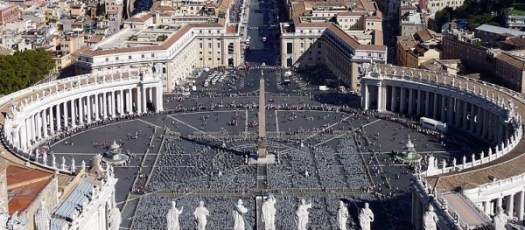 Площадь Св. Петра в Риме с точки зрения архитектурной композиции устроена и размечена весьма замысловатым образом. Главные оси овала, лежащего в основе формы площади, очень точно сориентированы по сторонам света. Этот факт подчёркивает огромный, размером на всю площадь прямой крест, выложенный мрамором на мостовой, так что одна – большая – перекладина креста соответствует оси Север-Юг, а вторая перекладина, соответственно, – оси Восток-Запад.