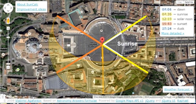 На среднем фото: программа SunCalc в приложении для анализа спутникового снимка площади Св. Петра, полагая центром точку расположения обелиска. Жёлтые лучи линий соответствуют азимутам на точки восхода в дни летнего и зимнего солнцестояний.