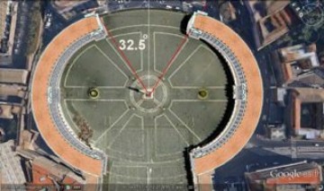 Высоченная игла гранитного обелиска, установленного в точке пересечения перекладин крестов — в геометрическом центре площади, иными словами — с давних пор используется как гномон солнечных часов. То есть тень обелиска служит в качестве стрелки, отмечающей на мостовой ход времени в течение дня. Но есть у обелиска, как выяснилось, и еще одна календарно-астрономическая роль, обнаруженная и подтвержденная исследователями лишь совсем недавно (Sparavigna, Amelia Carolina. Light and Shadows in Bernini’s Oval of Saint Peter’s Square. PHILICA Article number 540. November 8, 2015 ).