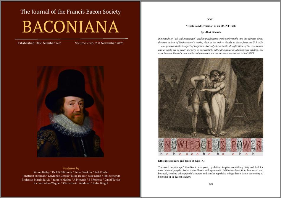 Альманах Baconiana издаётся британским Обществом Фрэнсиса Бэкона с 1886 года. В свежем выпуске за 2025 год (Number 262, Volume 2 No 2) опубликована — в переводе на английский — наша статья о роли шифров Бэкона в делах установления исторической правды.